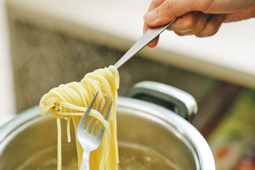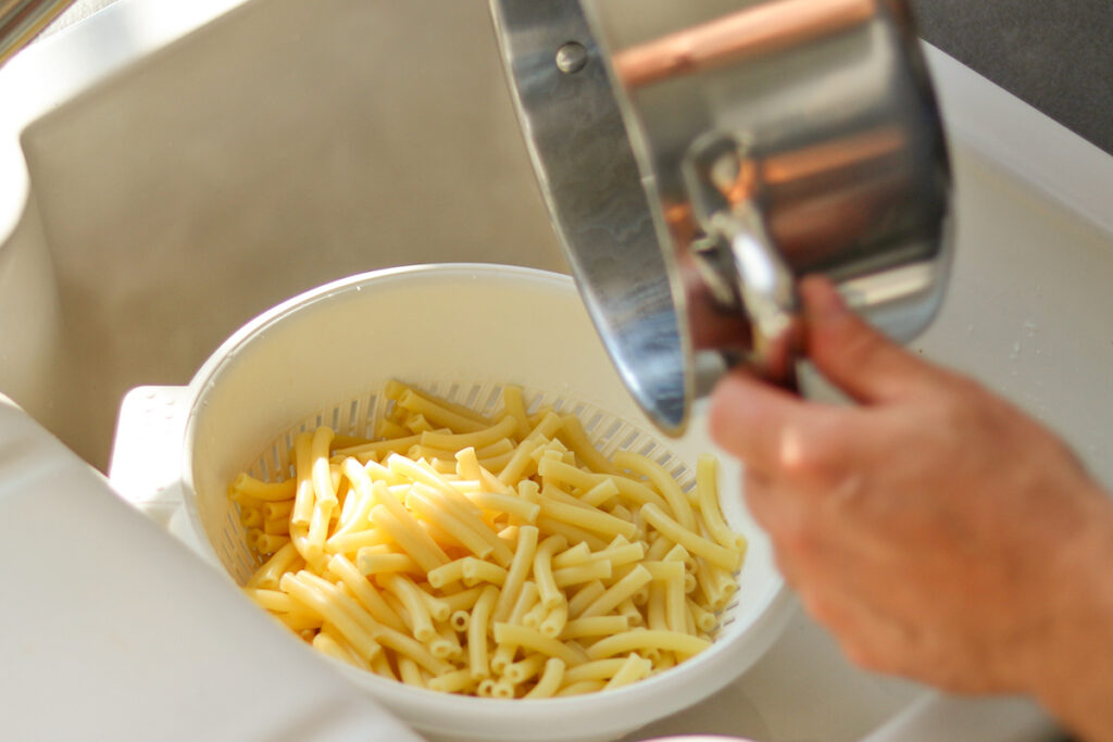 This tip often surprises people because nearly every box of pasta suggests cooking until al dente — tender, but with a bit of chewiness. However, I have a good reason for pulling it earlier, a lesson I learned early in my professional career.