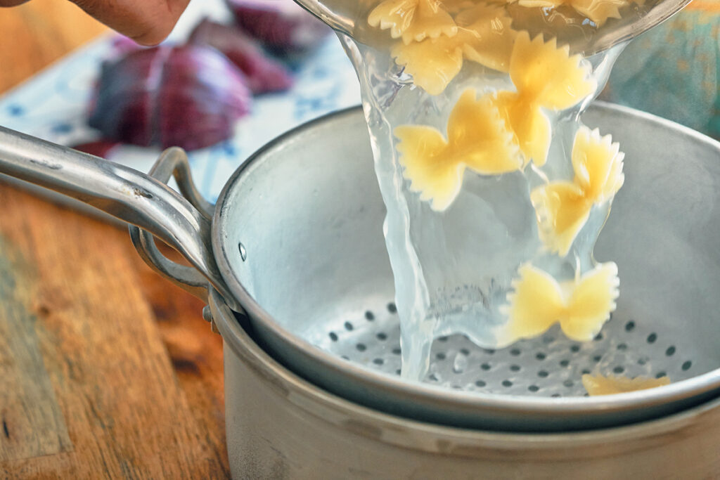 When I mentioned that pasta continues to cook after it’s drained, you might have thought, “If I rinse it with cold water, that will stop the cooking.” You’d be right — but you’d also be ruining the dish. I’ve seen many students in my cooking classes rinse or oil their pasta to keep it from clumping, but it’s a mistake.